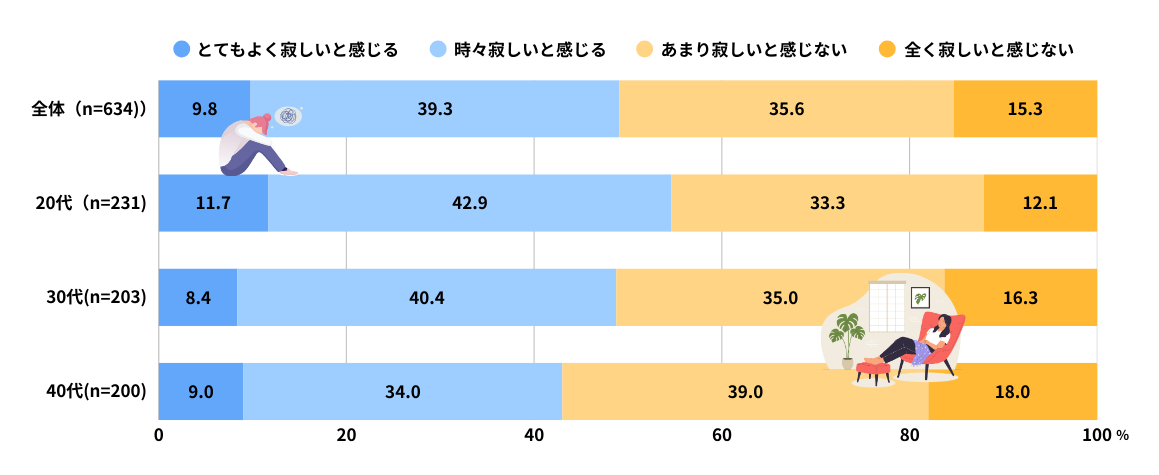 40代は逆に「あまり、寂しいと感じない」「全く寂しいと感じない」が57.0%と6割弱で、寂しいと感じていない人の方が多い傾向で、年を重ねるにつれて、寂しさを感じる頻度が少なくなっている傾向が見られました。