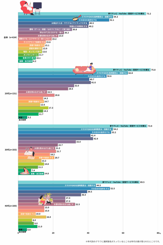 年代別の特徴で見ると、20代は「スマホやSNSを長時間見る・投稿する」(62.8%)、40代は「お酒を飲みながら過ごす」(32.5%)が他の年代よりも多い傾向でした。