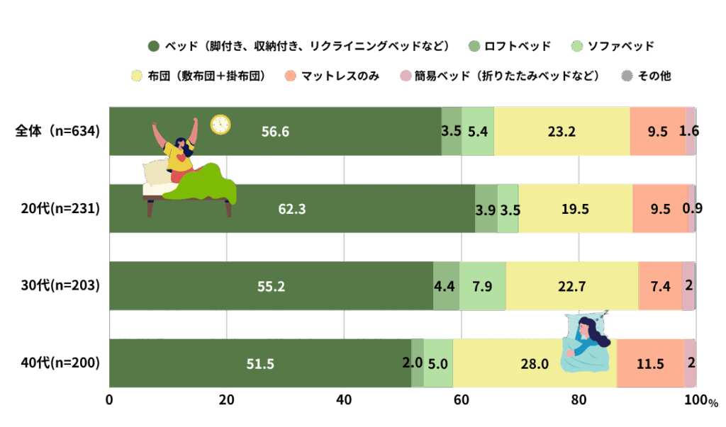 40代は、布団派が28.0%と年代別では最も多く、30代は22.7%、20代は19.5%と、年代が下がっていくごとに、少なくなっていく傾向でした。