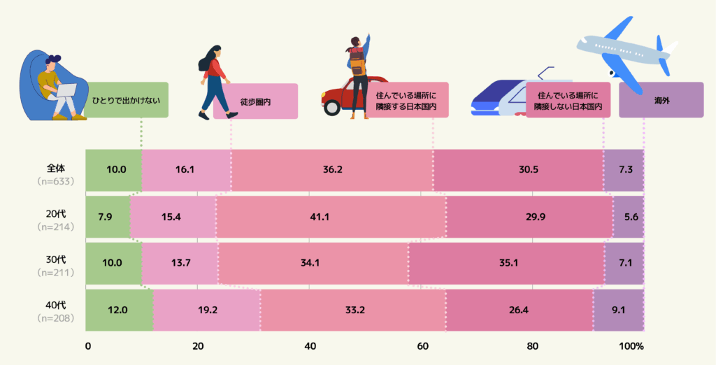 年代別に見ると、「住んでいる場所に隣接する日本国内」は20代、 「住んでいる場所に隣接しない日本国内」 は30代が多く、活動範囲の変化が見られました。